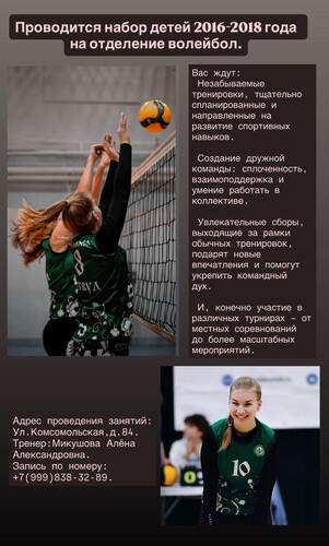Спортивная школа олимпийского резерва «Пахра» объявляет набор на отделение "волейбол" тренера-преподавателя Микушовой Алёны Александровны.