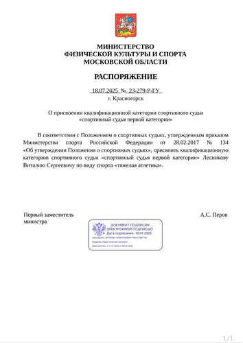 Распоряжением №23-279-Р-ГУ от 18.07.2025 г. Министерства физической культуры и спорта Московской области присвоена квалификационная категория спортивного судьи "спортивный судья первой категории" инструктору-методисту отделения "тяжелая атлетика" СШОР "Пахра" Лесникову Виталию Сергеевичу. Поздравляем Виталия Сергеевича! Так держать! | |